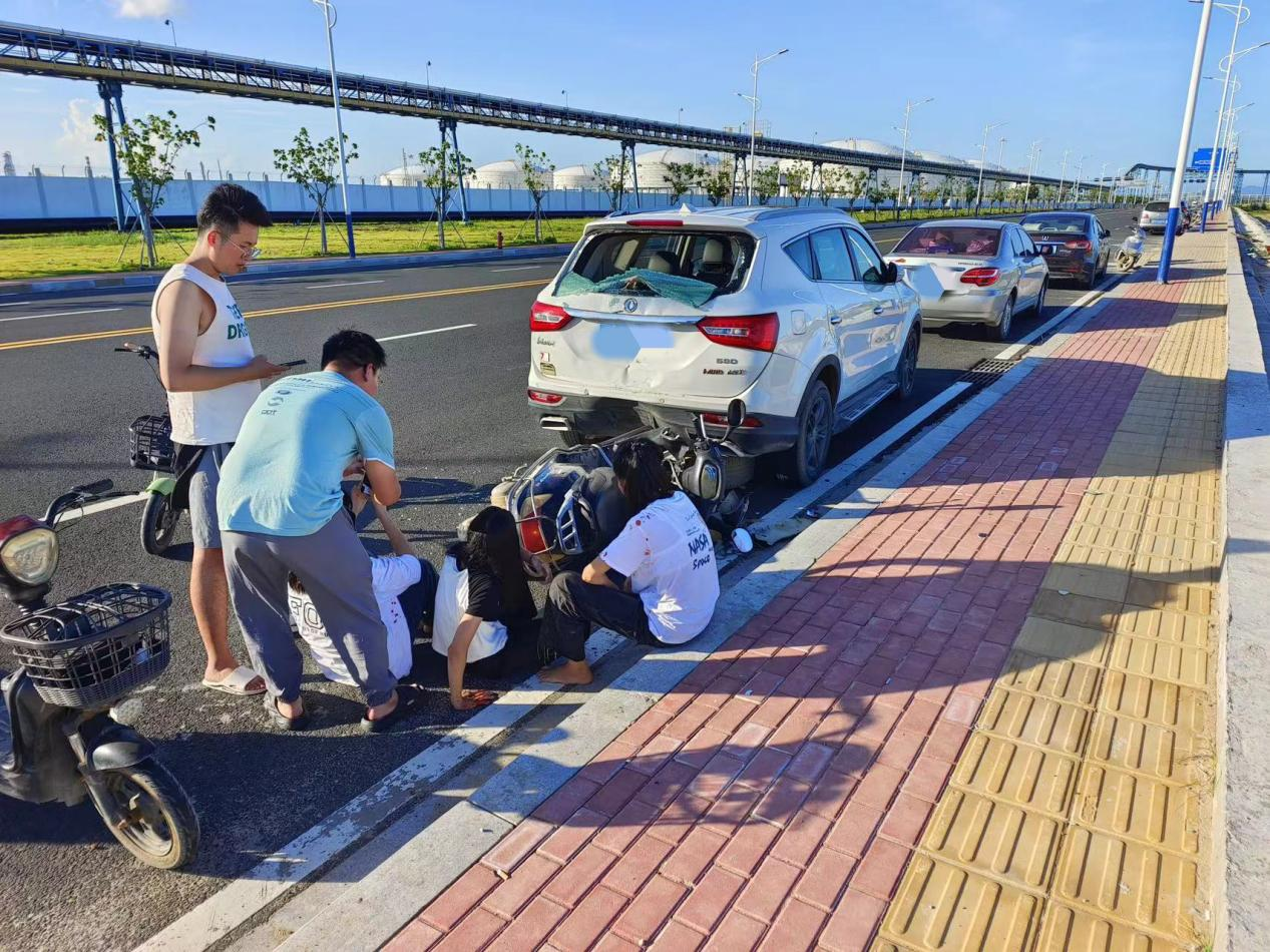近日,在大南海石化工業(yè)區(qū)環(huán)海南路發(fā)生一起交通事故,兩位年輕人的暖心行為引起了廣泛關(guān)注。據(jù)了解,7月24日下午15時(shí)許,一輛電動(dòng)摩托車(chē)撞上了停放在路邊的小汽車(chē),三位女孩受傷,其中,兩名女孩傷勢(shì)嚴(yán)重,躺在地上無(wú)法動(dòng)彈。就在這時(shí),兩位年輕人跑了過(guò)來(lái),向其中一位傷勢(shì)較輕的女孩了解具體情況,對(duì)另外兩位女孩子進(jìn)行安撫陪伴,并聯(lián)系小汽車(chē)車(chē)主。此時(shí),另一位好心市民也跑過(guò)來(lái)幫忙,撥打了110和120。兩位年輕人一直陪伴在三位女孩身邊,直至救護(hù)車(chē)將她們送到醫(yī)院治療才離去。